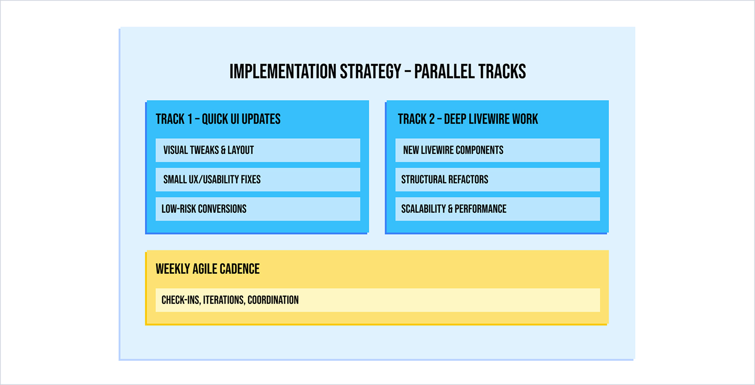 Full Livewire conversion wasn’t always feasible within the schedule. We prioritized critical paths for full conversion and applied UI-only updates elsewhere, documenting follow-up migration steps for future sprints.