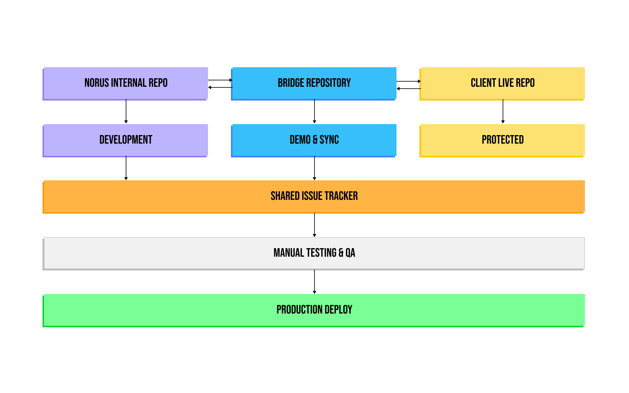 To protect production stability, Norus maintained a bridge repository; a local Git environment connecting Norus’ internal repo and the client’s live repo. This enabled safe bidirectional syncing without disrupting the client’s existing workflows.