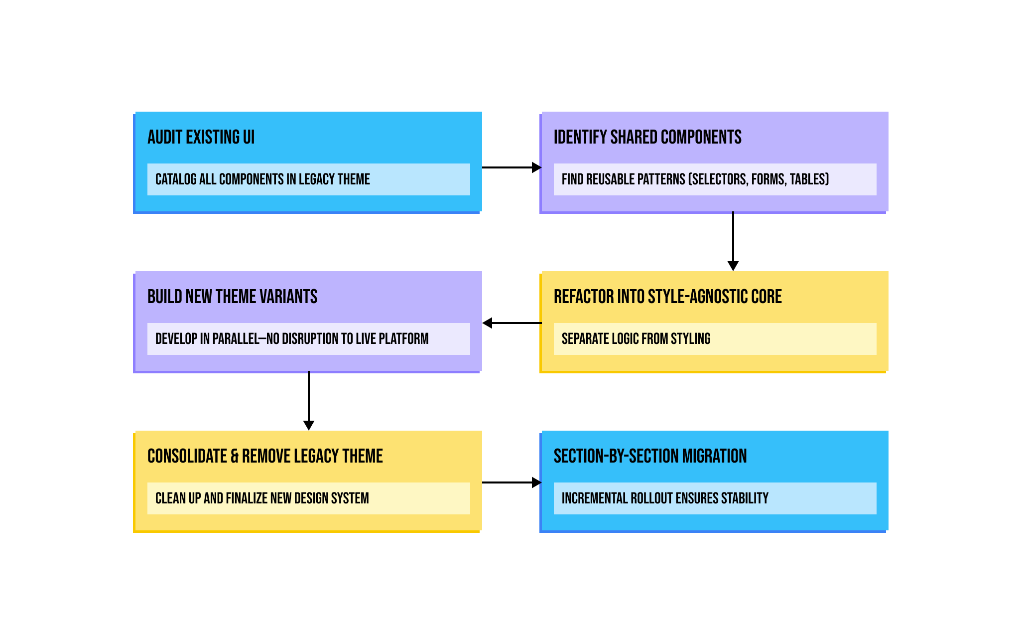 Because the platform was live, we updated the theme section by section, incrementally introducing the new design system: